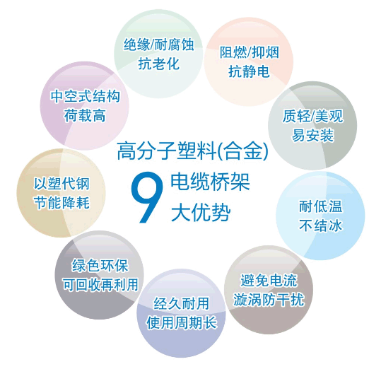 产品材料本身具有绝缘、耐腐蚀、阻燃耐侯性强的特性,而添加不同特性的助剂可得到不同效果的特种产品,其涵盖了传统的热浸镀锌电缆桥架、铝合金电缆桥架、玻璃钢电缆桥架等各种产品。高分子合金电缆桥架集各种常规传统桥架的优势于一身,又可全部回收循环利用。